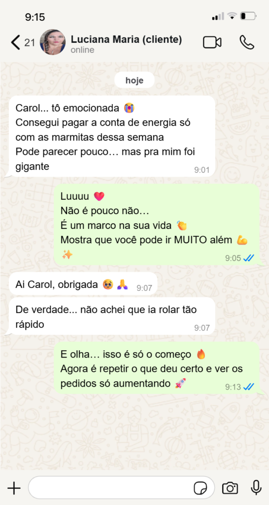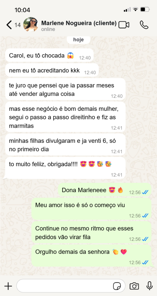 Depende do seu ritmo, mas muita gente já consegue vender nos primeiros 3 a 7 dias após começar — seguindo o passo a passo e usando o robô. Se você se dedicar pelo menos 1 horinha por dia, pode montar cardápios, divulgar e até fechar os primeiros pedidos em menos de uma semana.